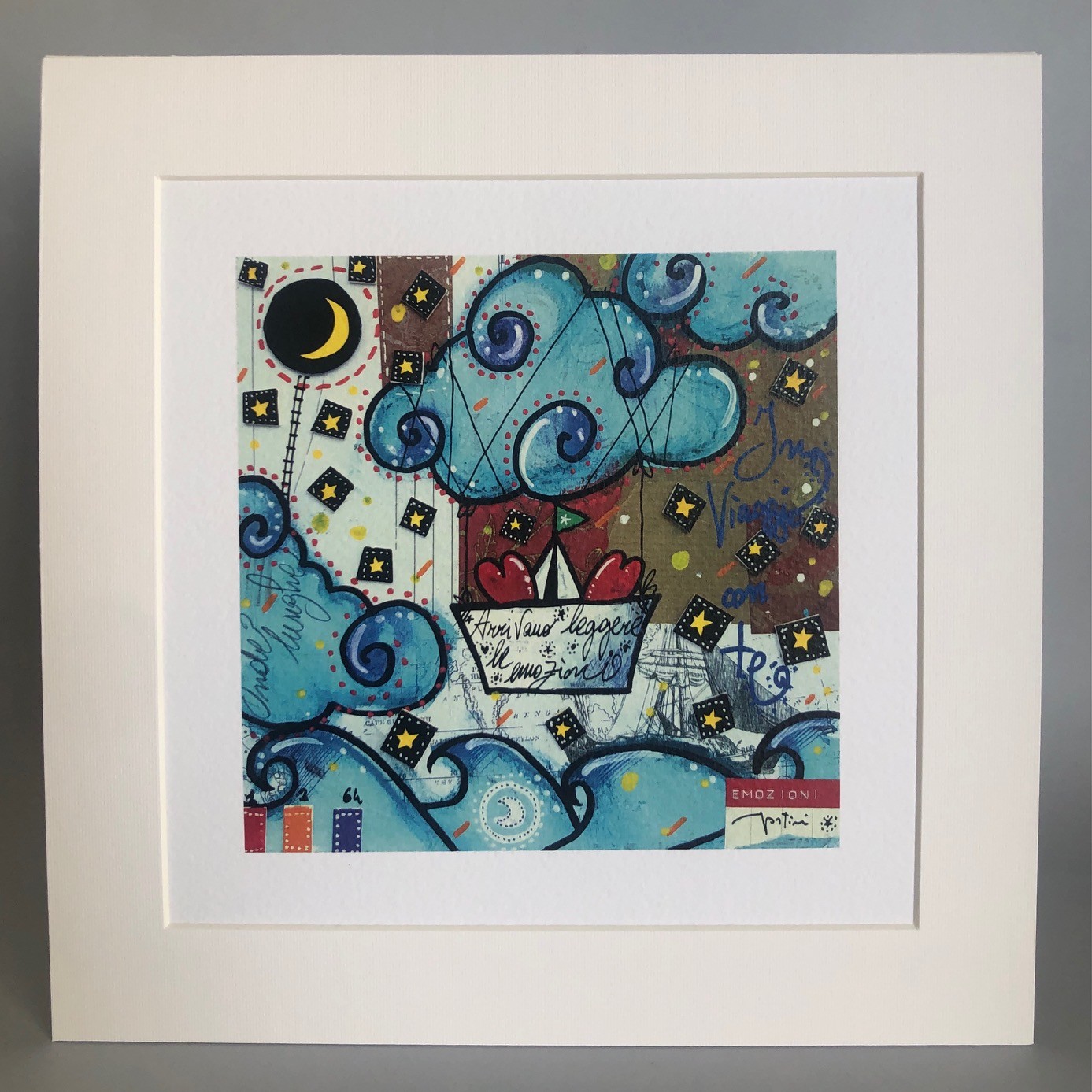 “comunicazioni visive” sono realizzate in tecnica mista, trasmettono emozioni, gioia, attraverso figure iconiche come fari, megattere, mongolfiere… e frasi sognanti